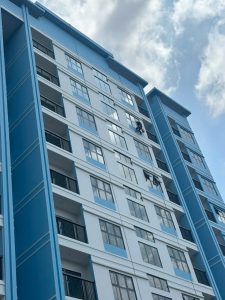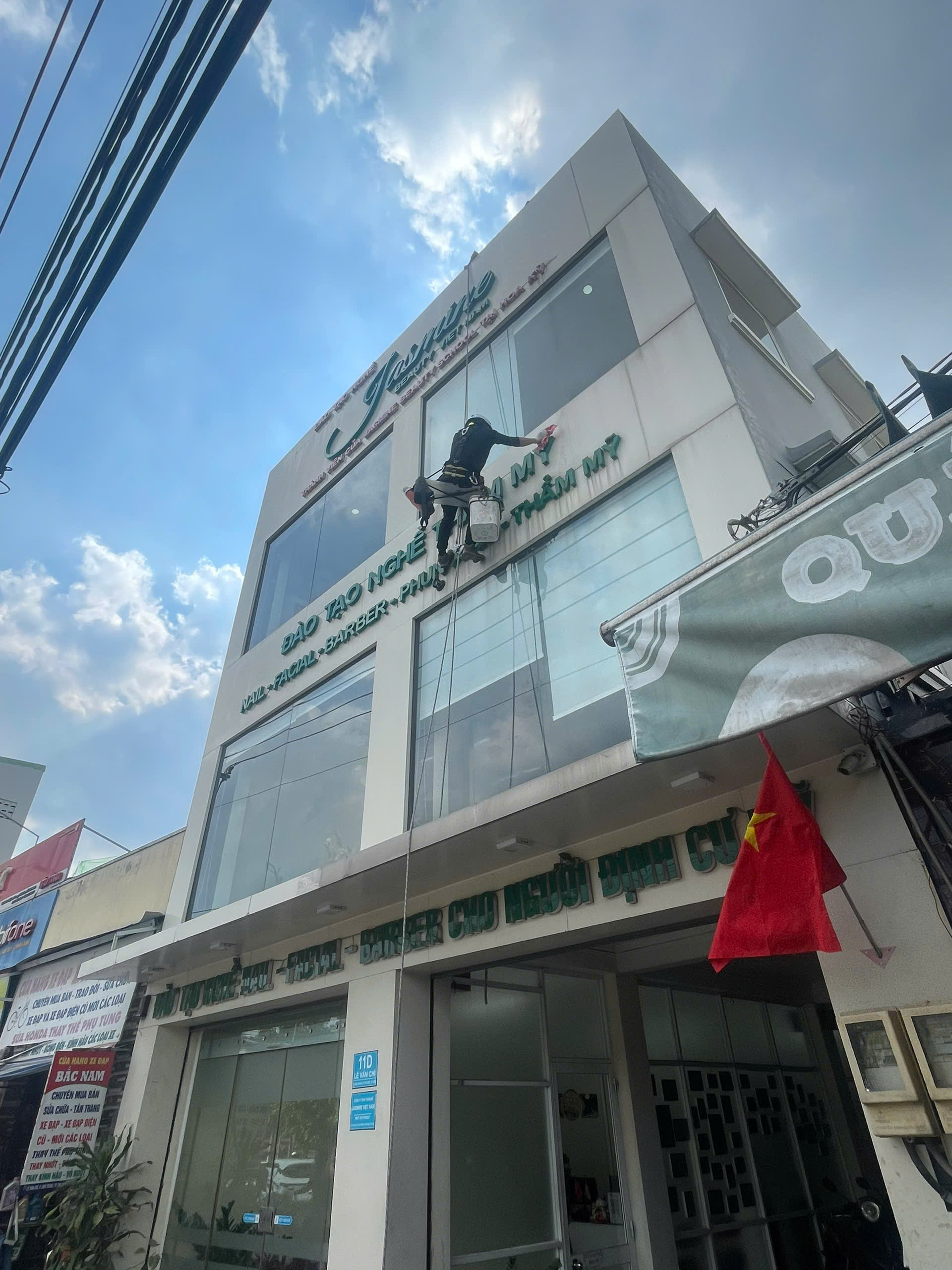 Đây là hạng mục phổ biến nhất, áp dụng cho văn phòng. Trung tâm thương mại, khách sạn, chung cư cao tầng. Việc lau kính mặt ngoài cần đến hệ thống dây an toàn (rope access), giàn giáo hoặc xe nâng chuyên dụng. Đội ngũ HLC Việt Nam được huấn luyện bài bản, đảm bảo an toàn tuyệt đối trong quá trình thi công.